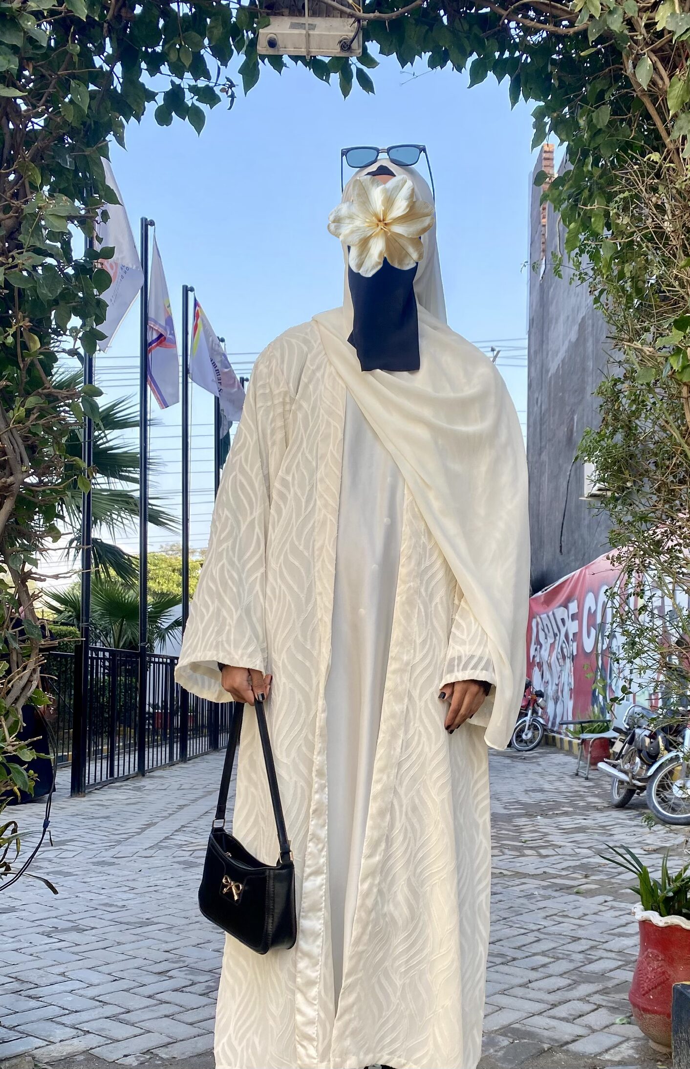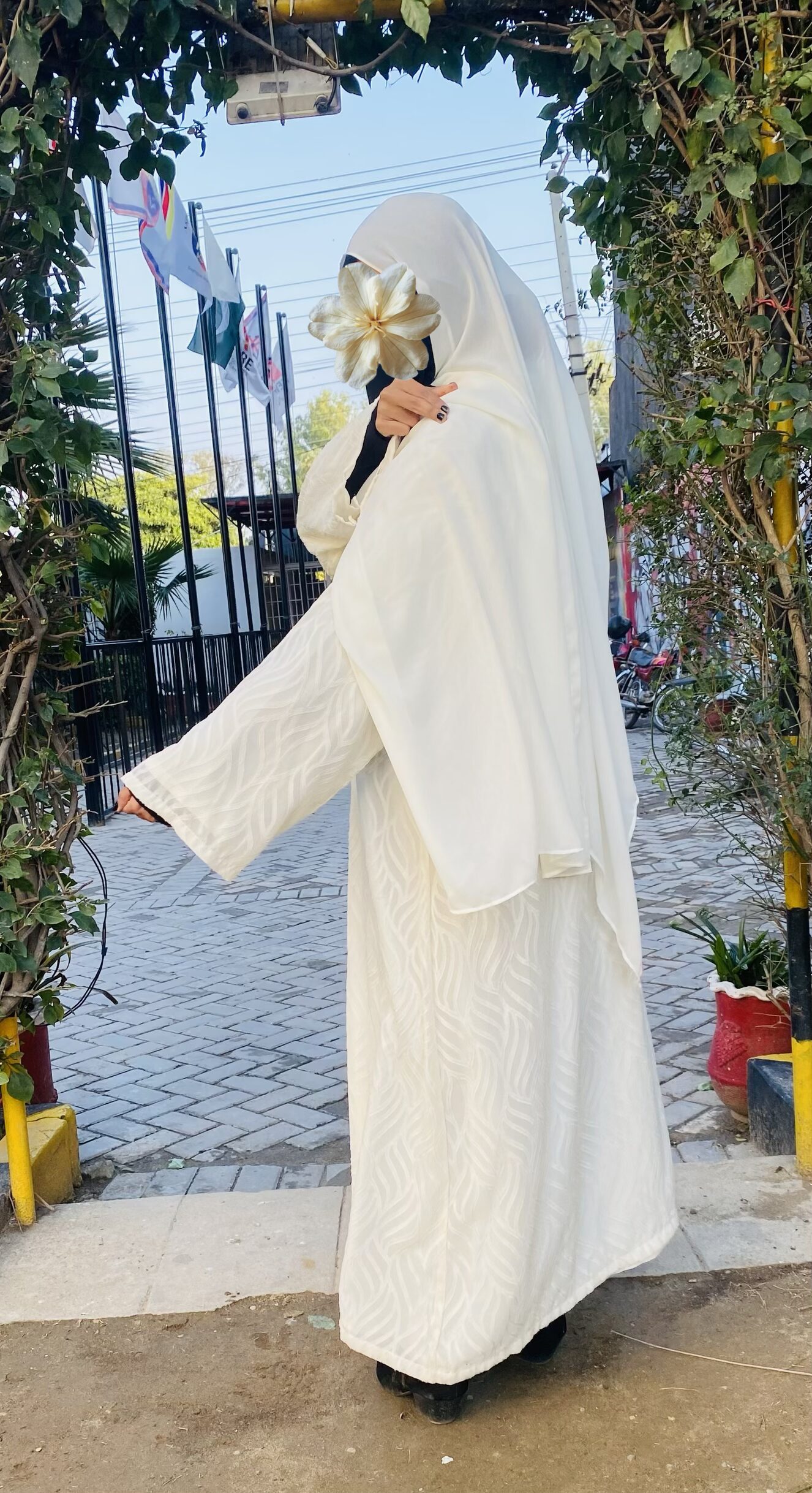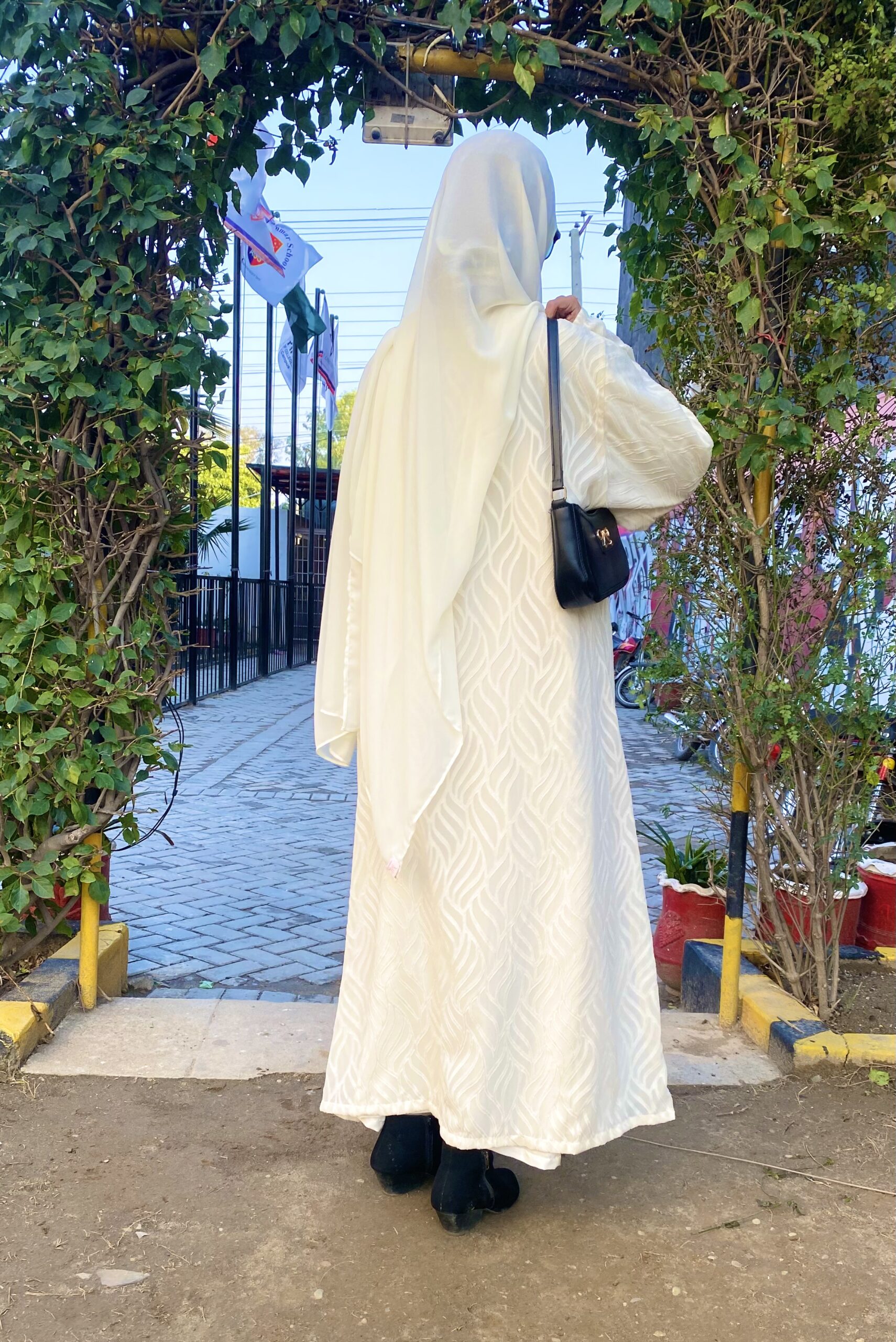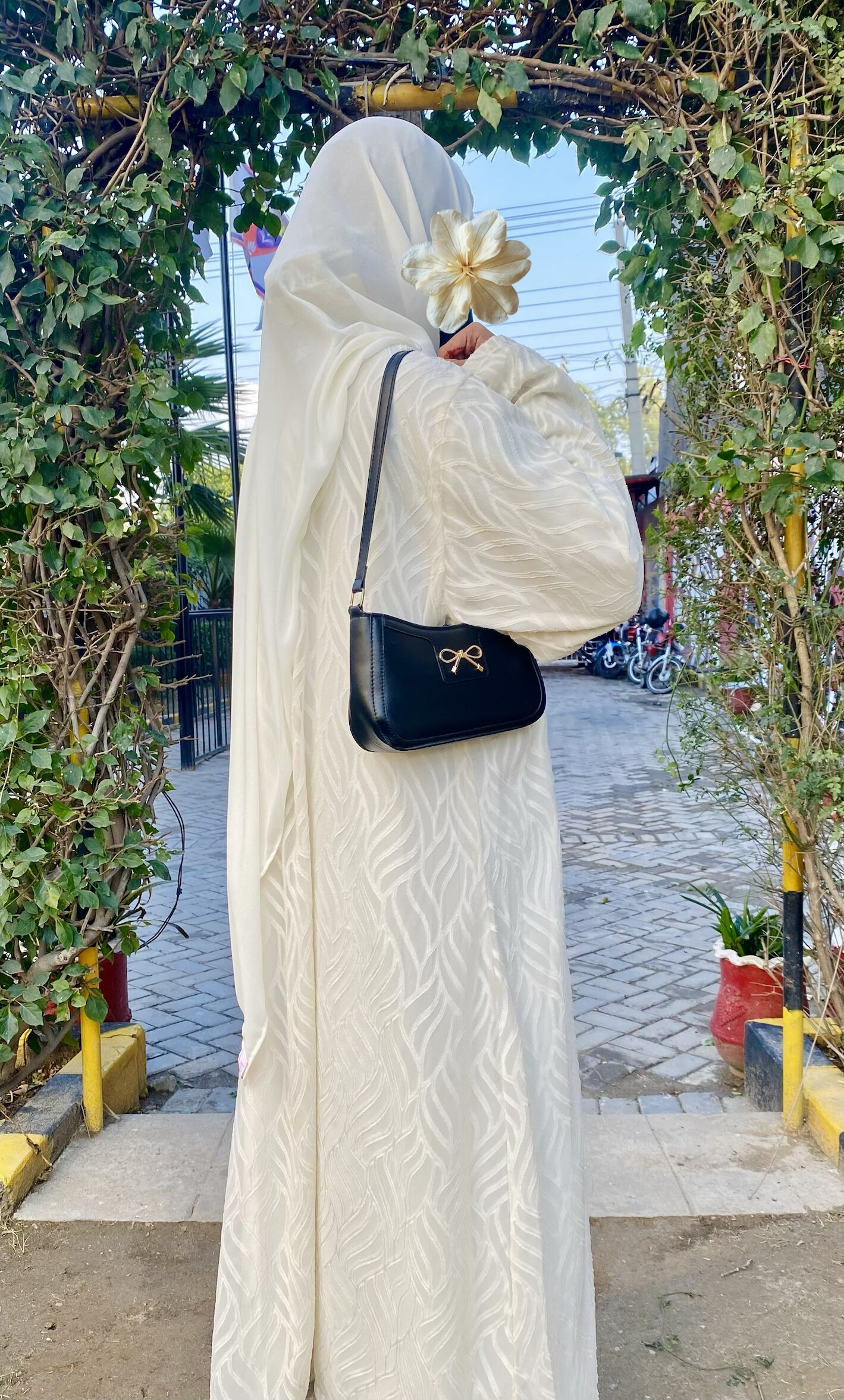 An ethereal two-piece white abaya set featuring unique wave-textured sheer sleeves. Perfect for brides, Eids, and formal evening events.