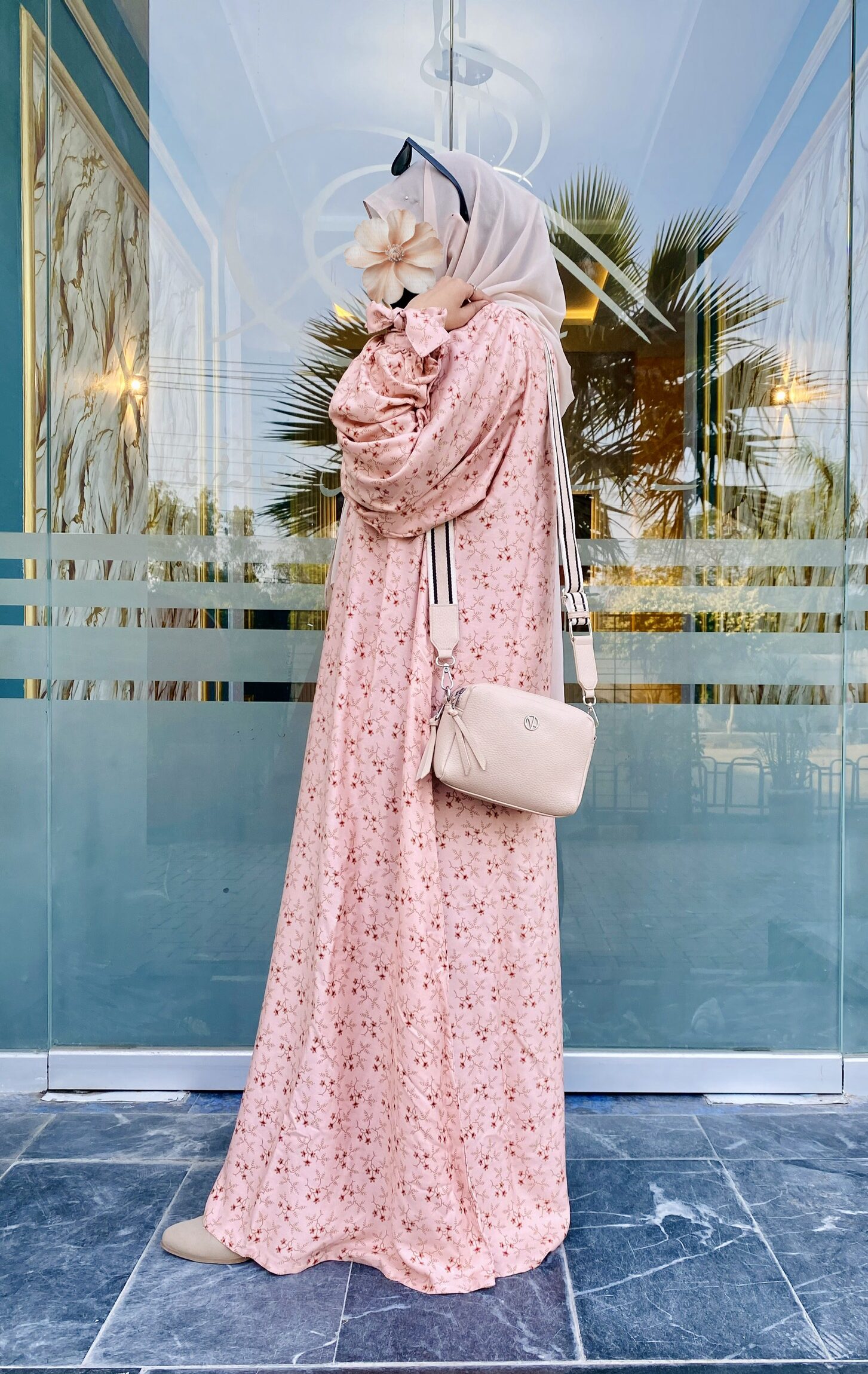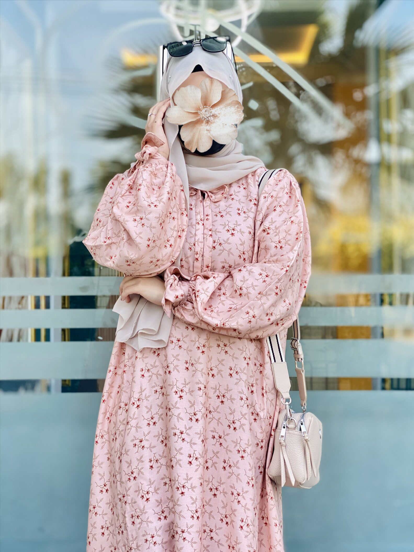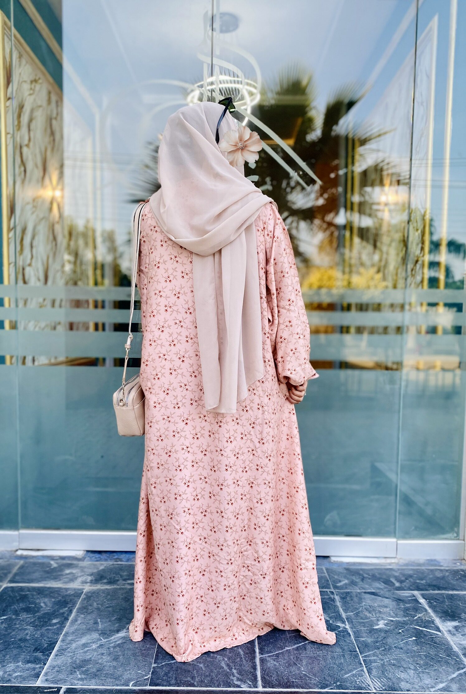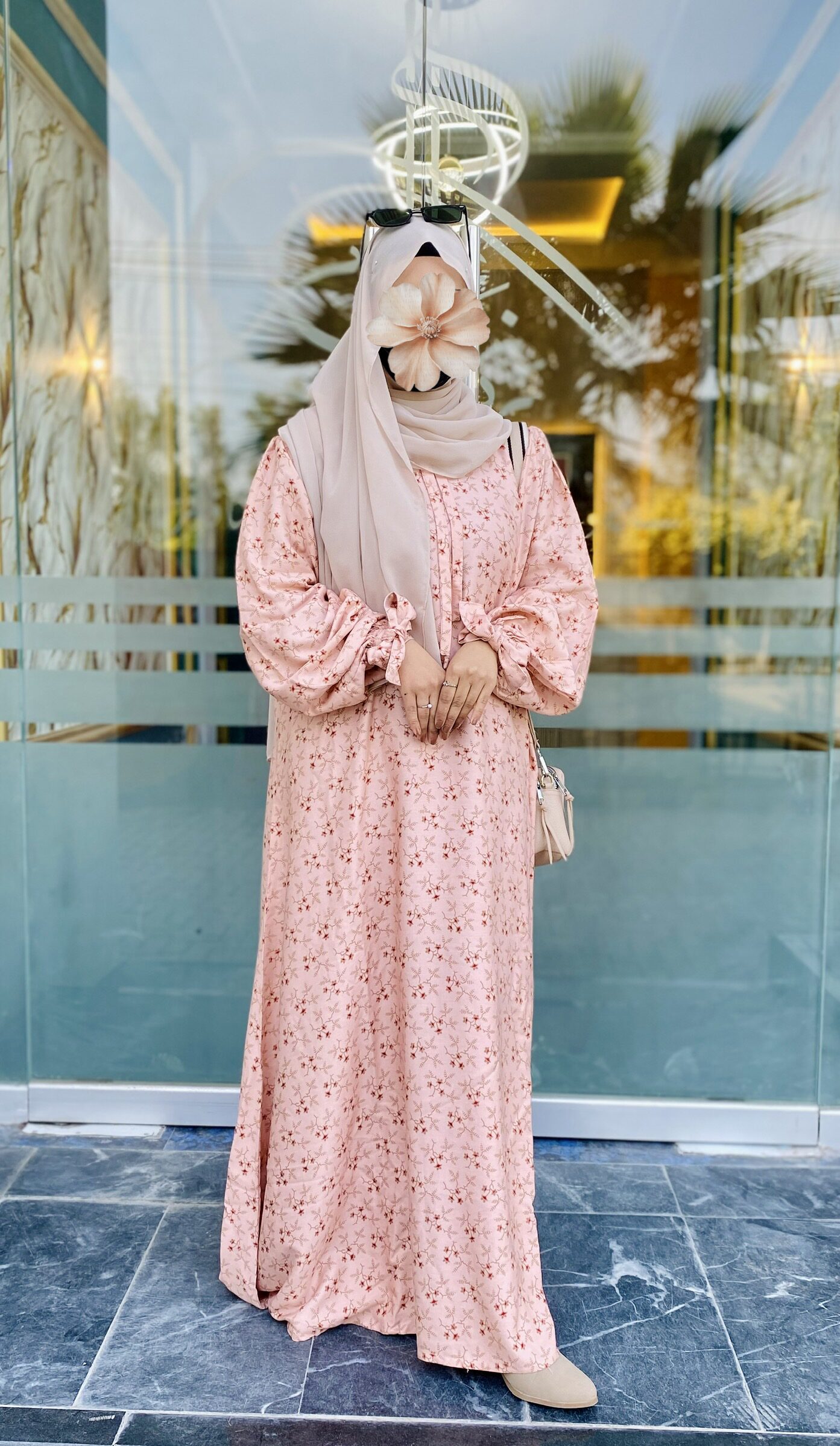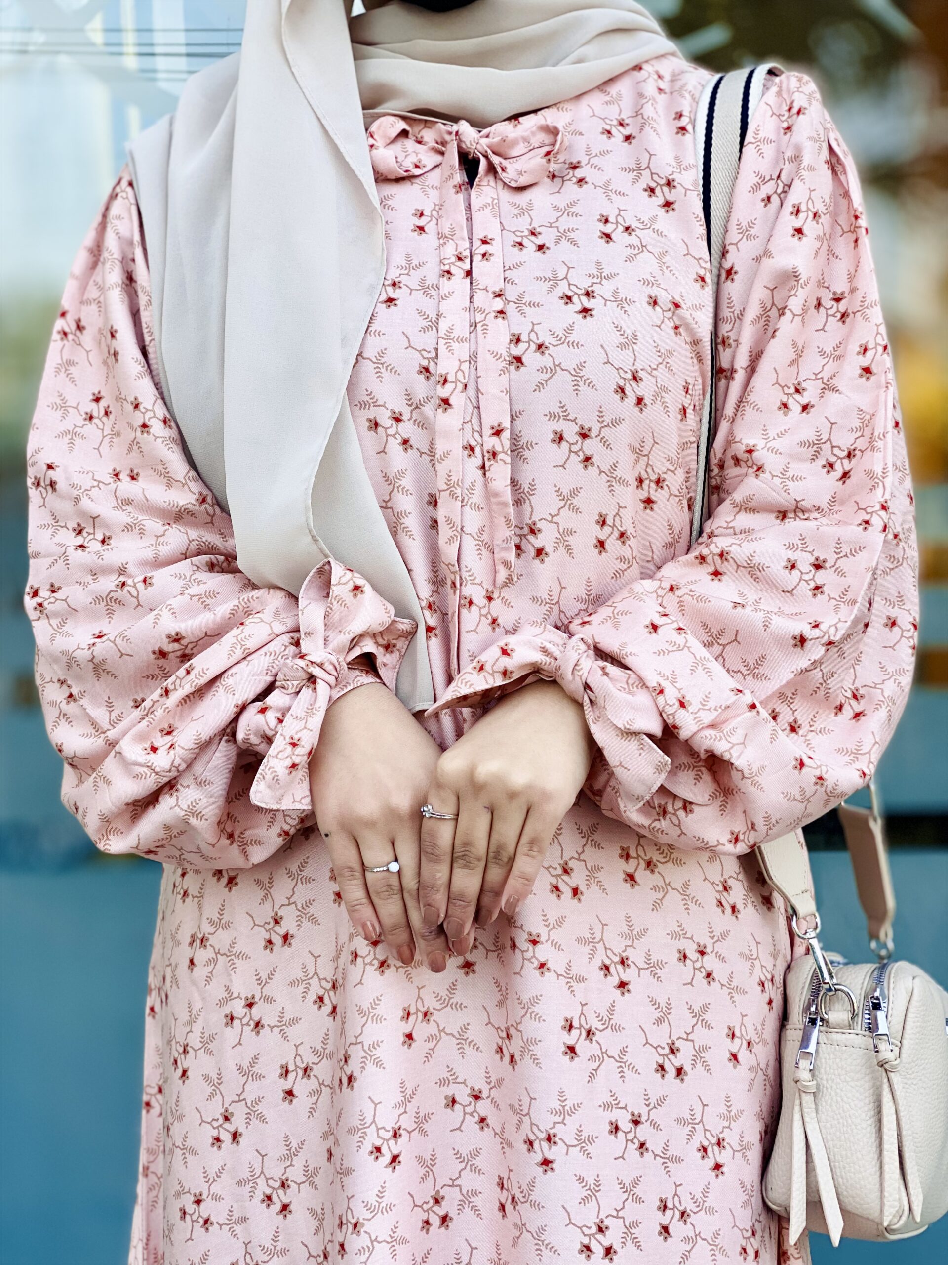 - Print: Delicate earthy-toned ditsy floral pattern on a soft peach base.
